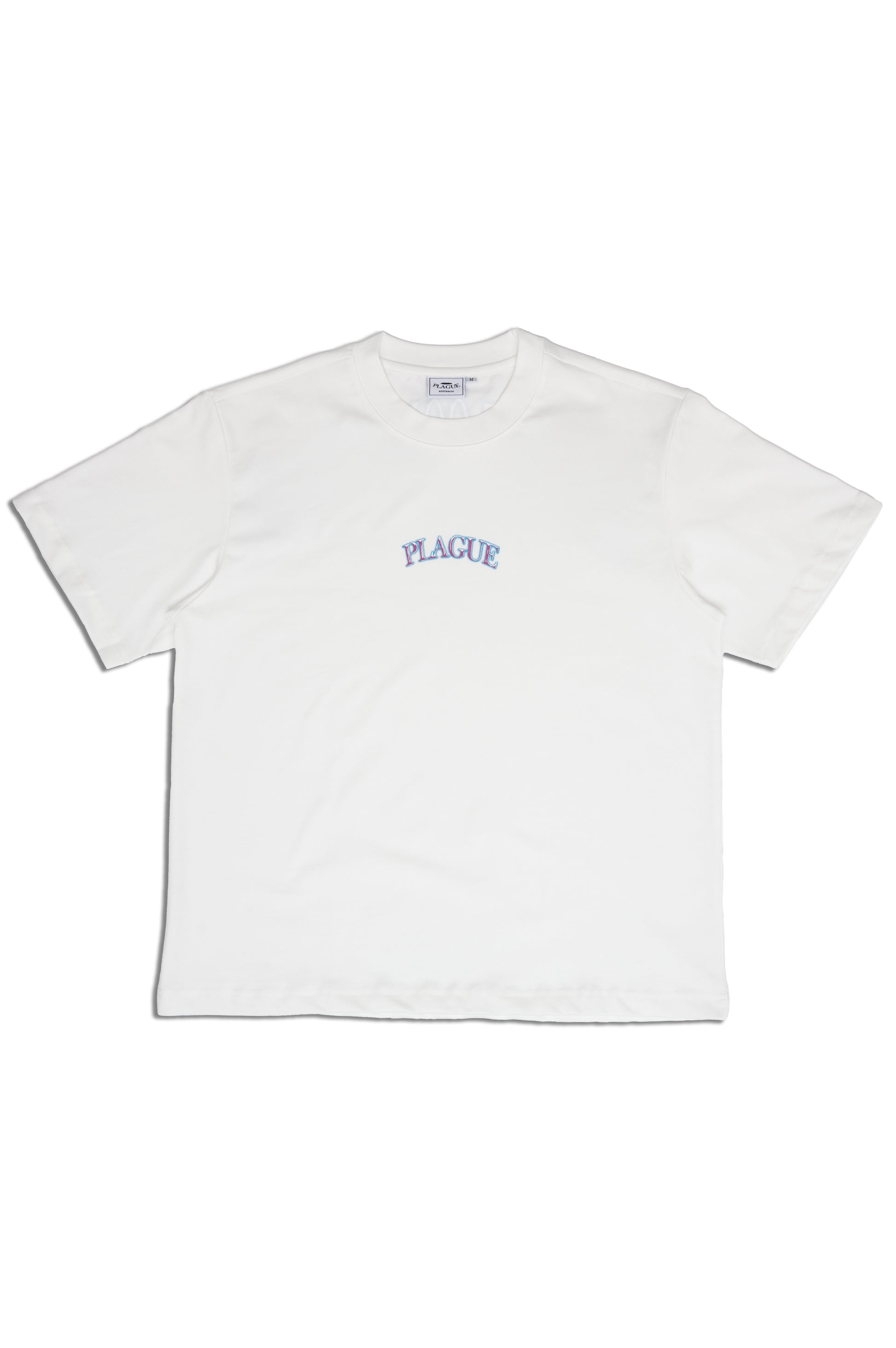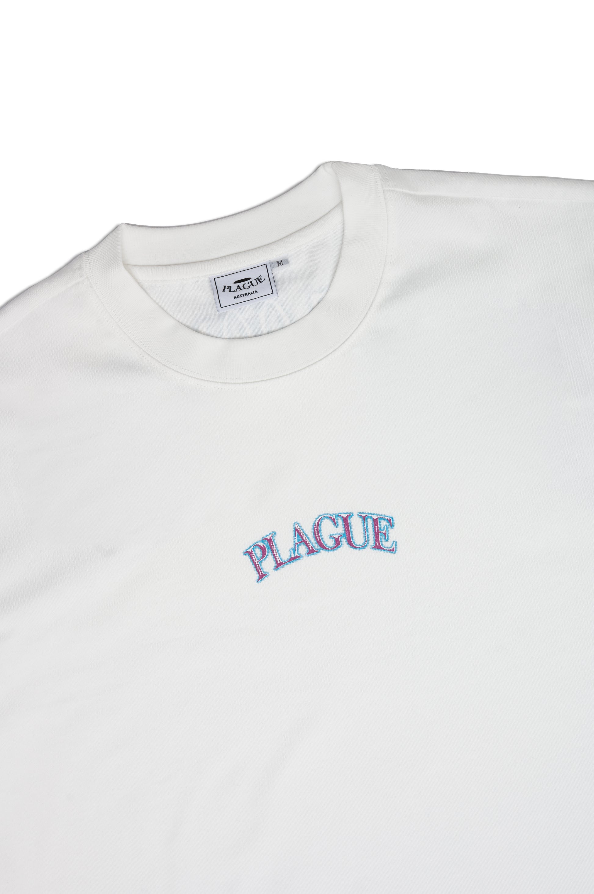 Features the neon glow PLAGUE logo screen printed on front chest and "Can't be contained" lettering screen printed on back.