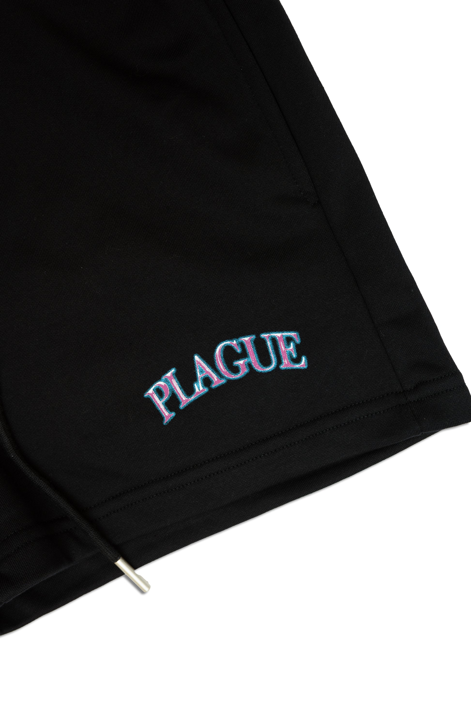 Features the neon glow PLAGUE logo screen printed on left leg. Also features drawstring at front and two side pockets