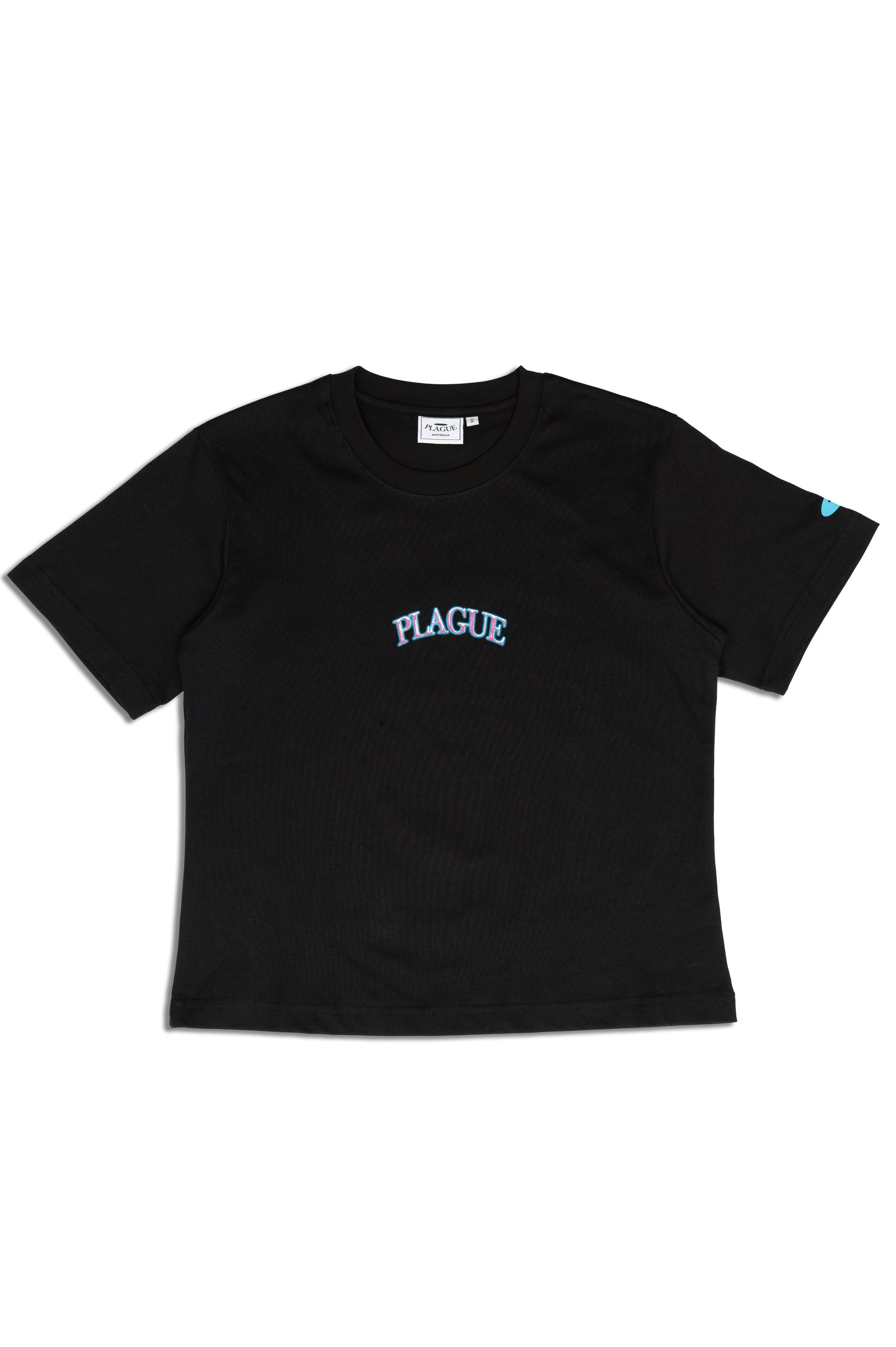 Features the neon glow PLAGUE logo screen printed on front chest and the Saucer logo on left sleeve